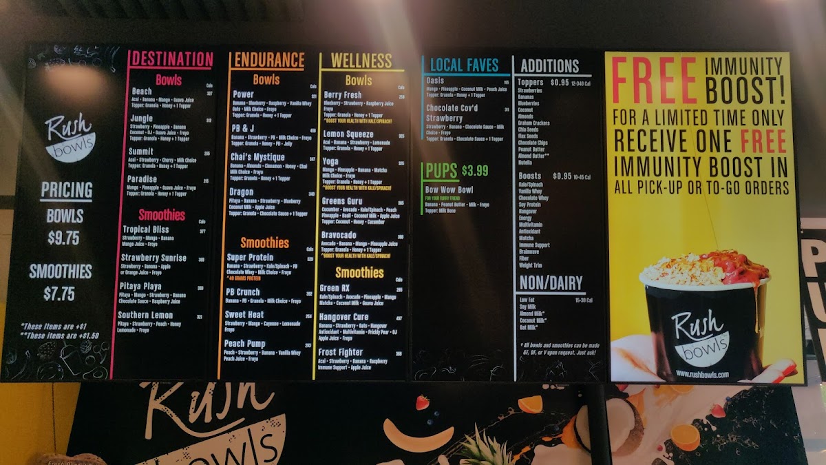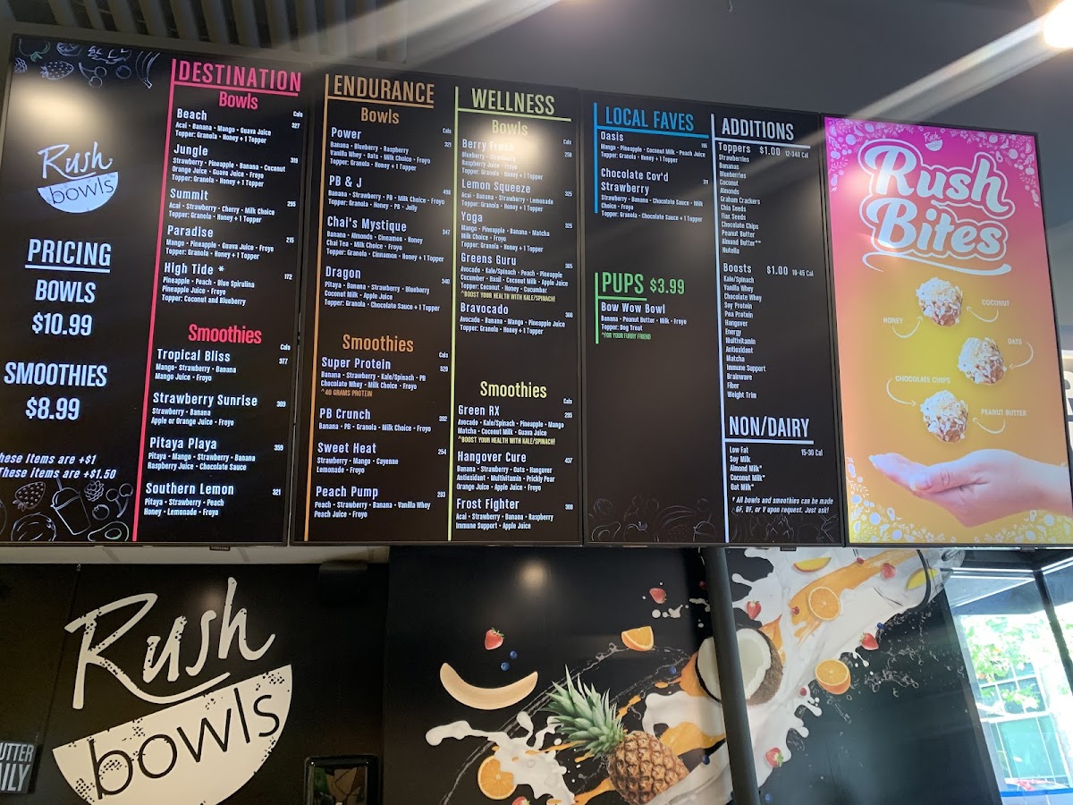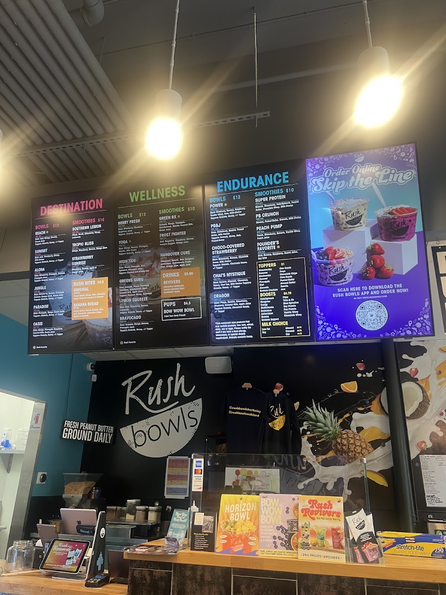 From a reviewer’s perspective, the menu at Rush Bowls offers a concise but appealing selection that makes it easy to find something refreshing and energizing. The Destination Bowls, including Beach, Jungle, SummitParadise, and High Tide Bowl, highlight tropical and adventurous flavor combinations, while the Endurance Bowls such as Power, PB & J, and Chai's MystiqueDragon are clearly geared toward customers looking for more filling, protein-focused options. The Wellness Bowls-Berry Fresh, Lemon Squeeze, YogaBravocado, and Greens Guru-round out the menu with lighter, health-focused choices that emphasize fresh fruits and greens. Overall, the menu is straightforward but well-structured, with clearly themed categories that help customers quickly choose based on whether they want something indulgent, energizing, or health-oriented.