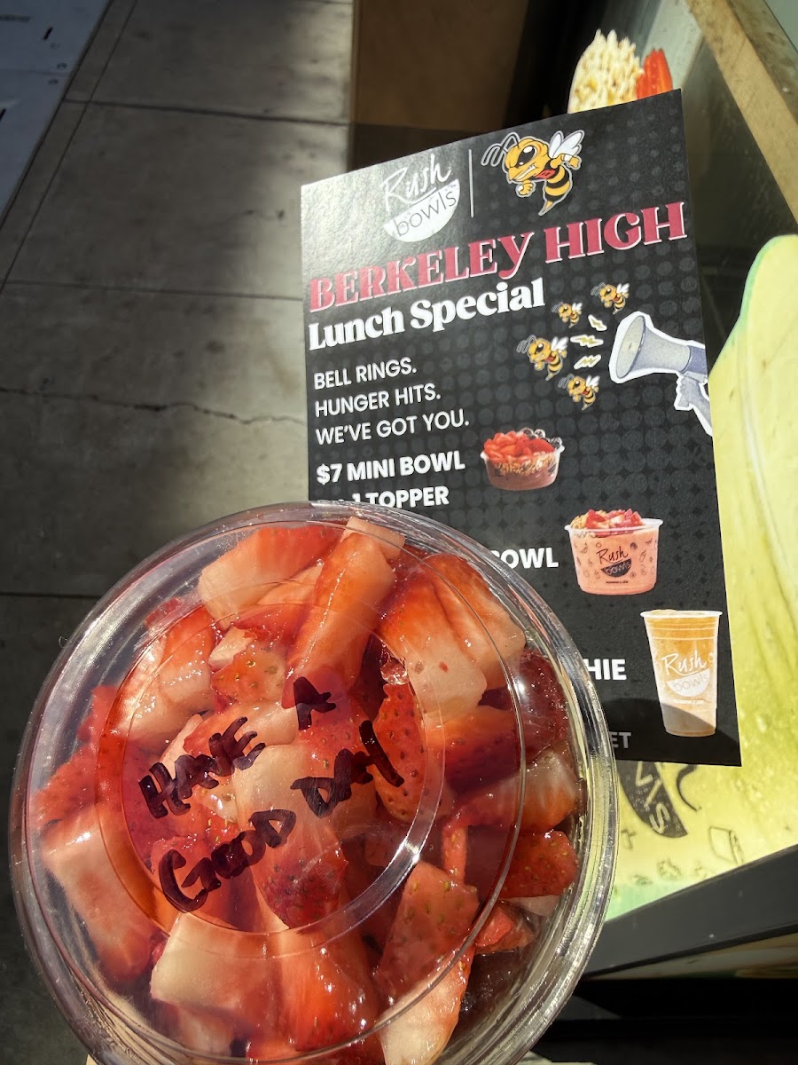 Banana, Strawberry, PB, Milk Choice, Froyo Toppers: Granola, Honey, PB, Jelly
